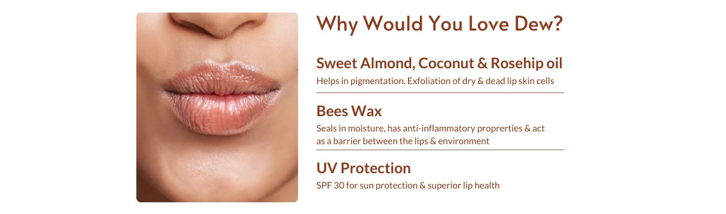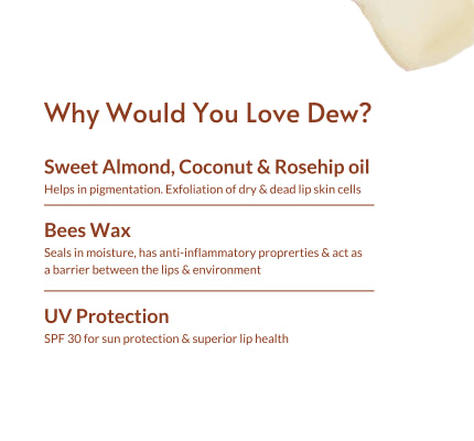 Light, Non-sticky & Reduces Pigmentation! Made with 5 Natural Oils, Bees Wax & Vitamin E, Sweet Almond , Coconut & Rosehip oil helps reduce Pigmentation. With SPF 30 for sun protection & superior lip healh. Refreshing hint of Coconut & Vanilla flavours. No Alcohol, No Water, No Color Added, No Paraben, No Petrolatum, Cruelty-Free & Vegan