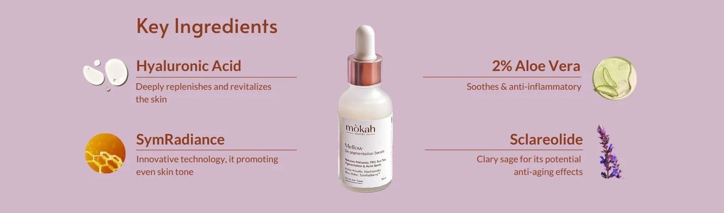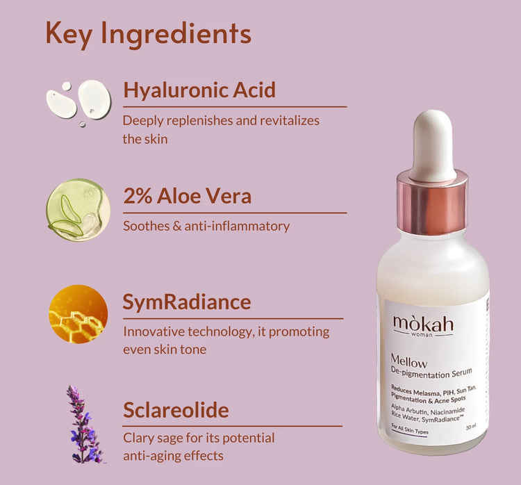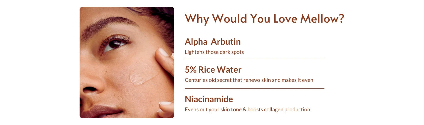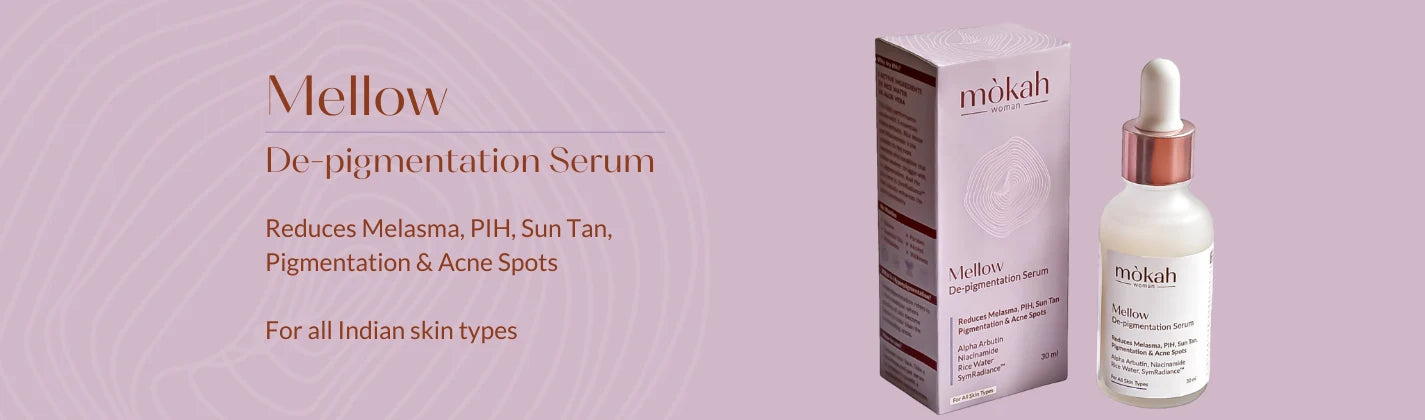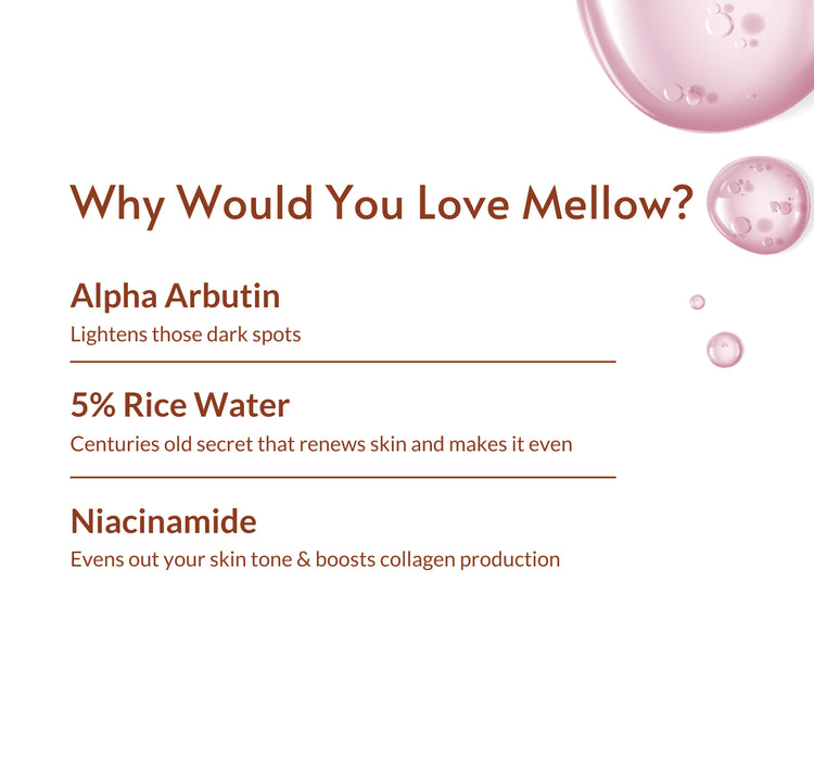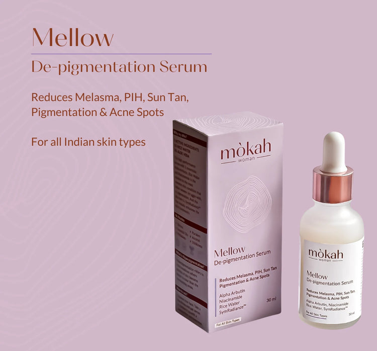 Mellow is a high-performance serum specifically formulated to tackle pigmentation issues that many Indian women face. With a powerful blend of Alpha-Arbutin, Rice Water, and Niacinamide, this serum effectively reduces melasma, post-inflammatory hyperpigmentation (PIH), and sun tan. Its five active ingredients work harmoniously to target pigmentation and acne spots, ensuring a more even skin tone. Infused with Aloe Vera for calming hydration, Mellow also features SymRadiance™, an innovative ingredient that enhances your skin's luminosity. Suitable for all Indian skin types, Mellow is your secret weapon for achieving a radiant and glowing complexion!